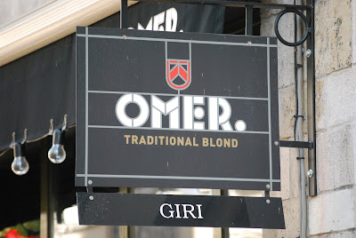 Omer ("Traditional Blond") Beer, which uses an almost heraldic Sable a chevron within a bordure gules as its trademark.
